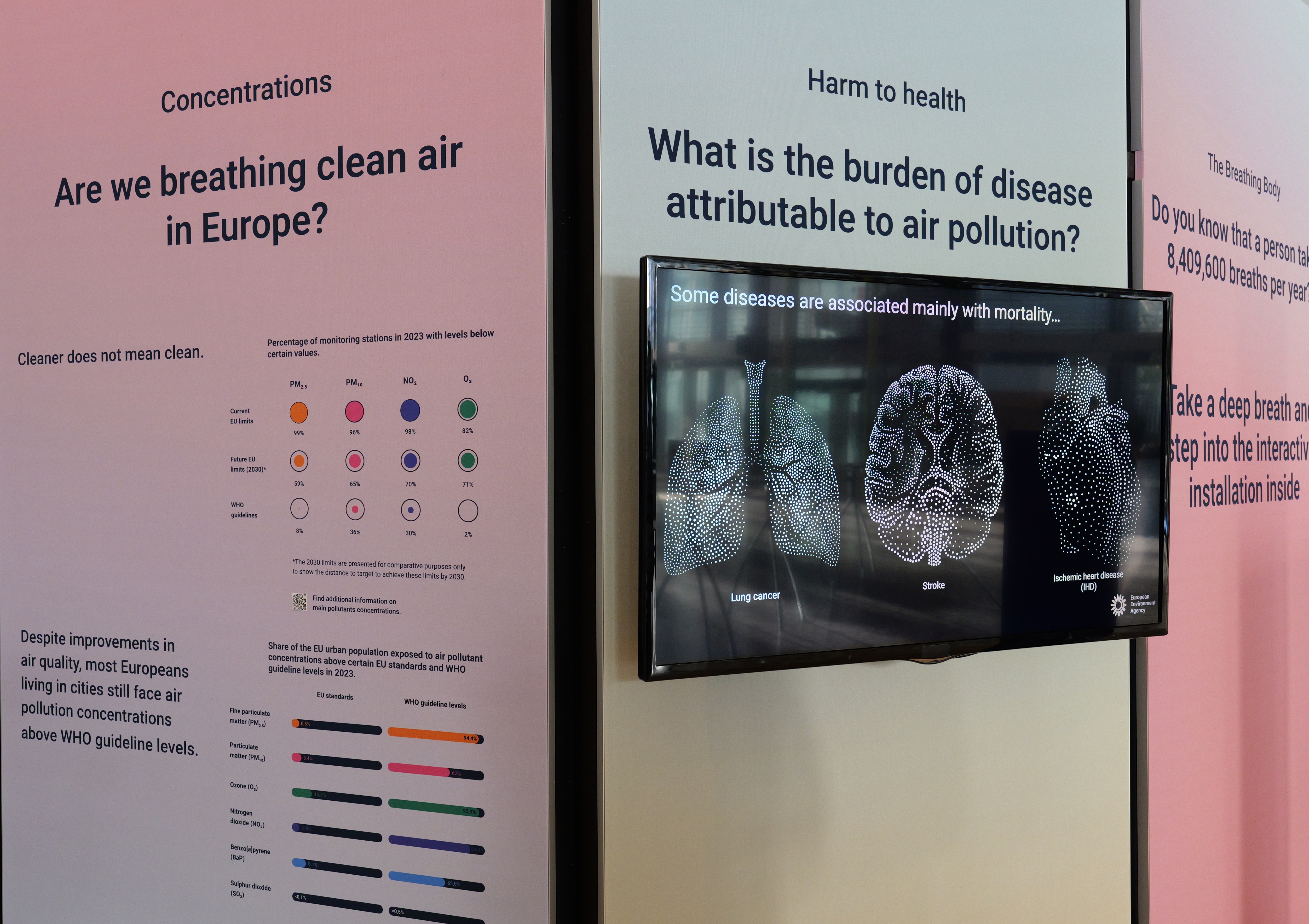 Stepping inside, the experience shifts. The focus moves from observation to awareness, from didactic understanding to sensing. A field of dots represents individuals across Europe, revealing the scale of impact while connecting the body to broader environmental systems. Scientific indicators such as premature deaths, years of life lost, and long-term exposure are translated into an embodied encounter where data is no longer abstract, but personal.