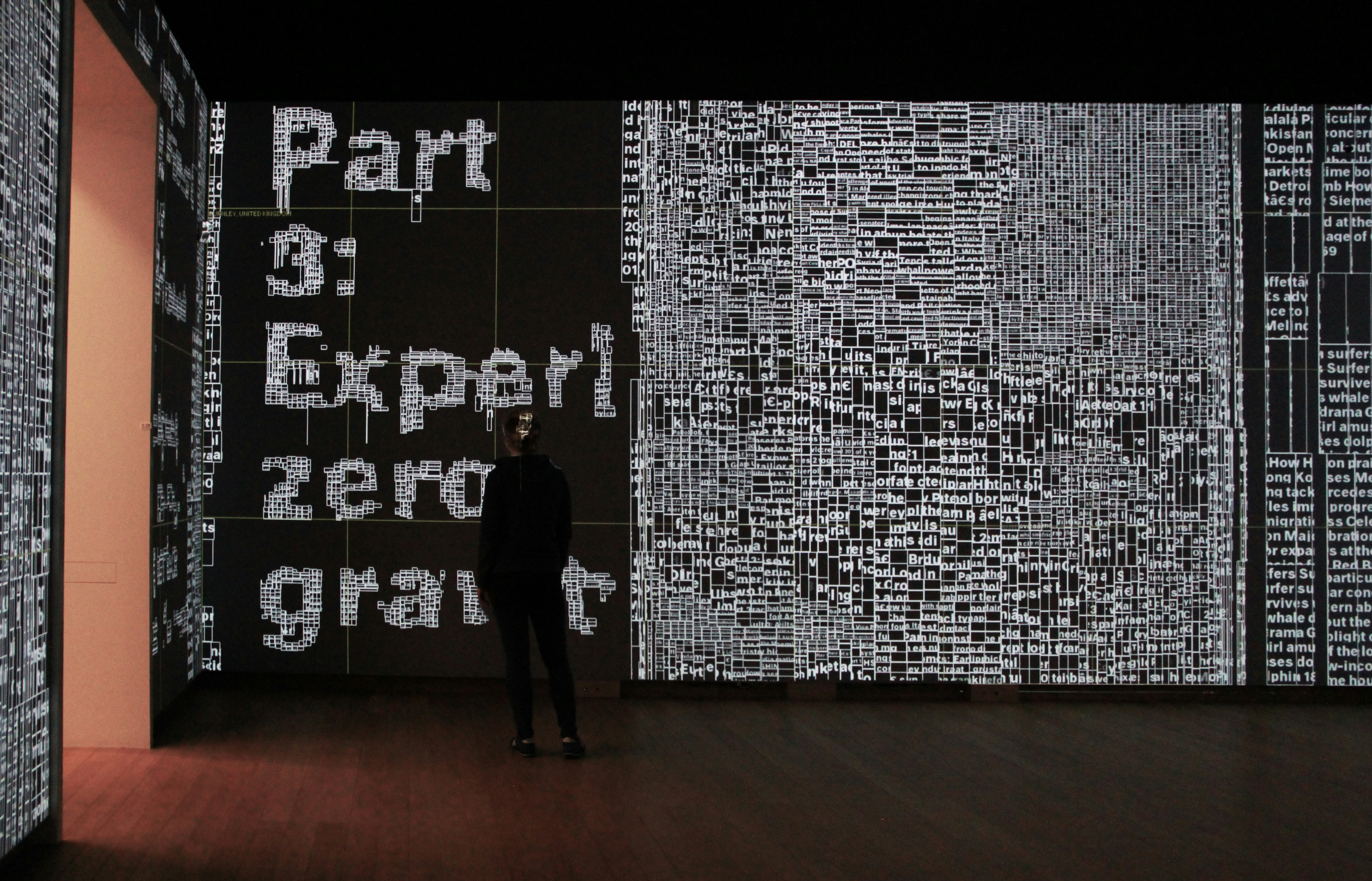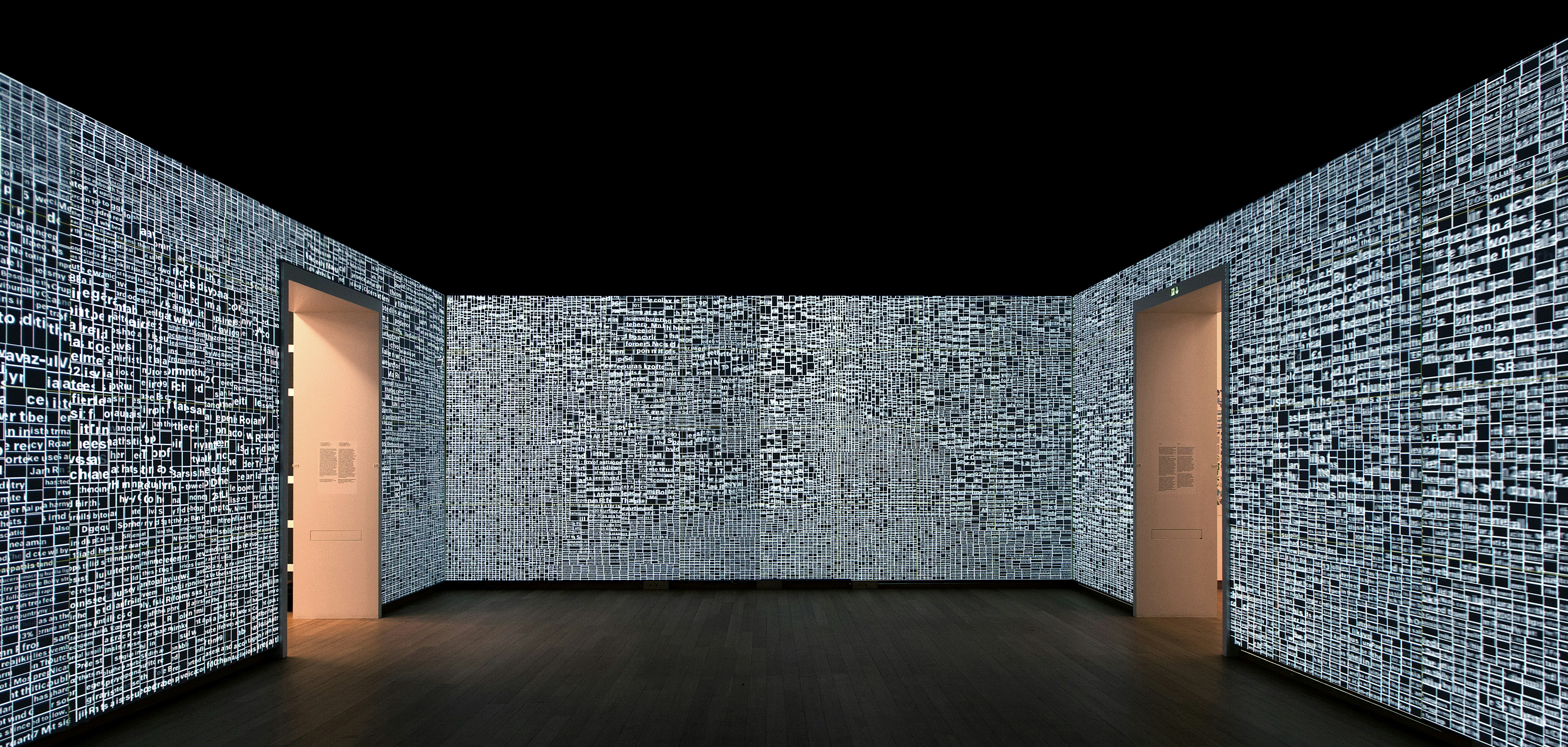 The visual dynamic of Schrofer’s typographic art suggests that his designs were created on the computer but they predate the digital era: Schrofer designed everything by hand. The installation visualizes information that continuously surrounds us and is always accessible. By searching for real-time locations currently in the news, like Ground Zero, Reichstag, or Tiananmen square, the installation can locate the panorama images from Google Streetview, abstract them into grids and fill the grids with new information. As a visitor to the space, you are literally 'transported’ to that location and surrounded by all the news associated with that specific location. Instead of a photographic representation, the place is represented purely typographically with a host of new items currently being talked about at that location. Nothing in the gallery space stands still; all information continuously moves.